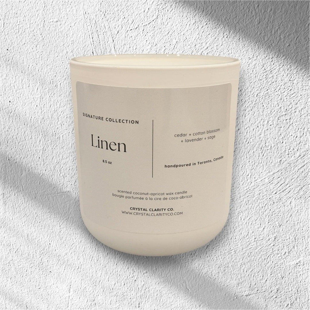 Hand-poured in Toronto using clean-burning coconut-apricot wax and a crackling FSC-certified wooden wick, Linen envelops your space in quiet calm—no laundry detergent required.