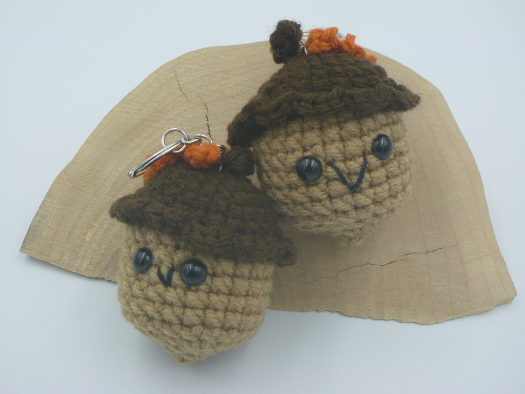 Acorn measures approx. 2 inches wide by 3 inches tall and is made from acrylic yarn and stuffed with polyfil.
