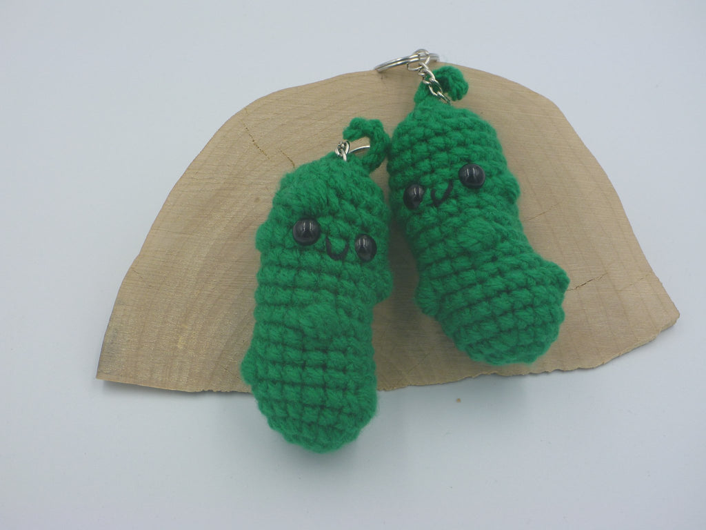 Pickle measures approx. 1.5 inches wide by 3.5 inches tall and is made from acrylic yarn and stuffed with polyfil.