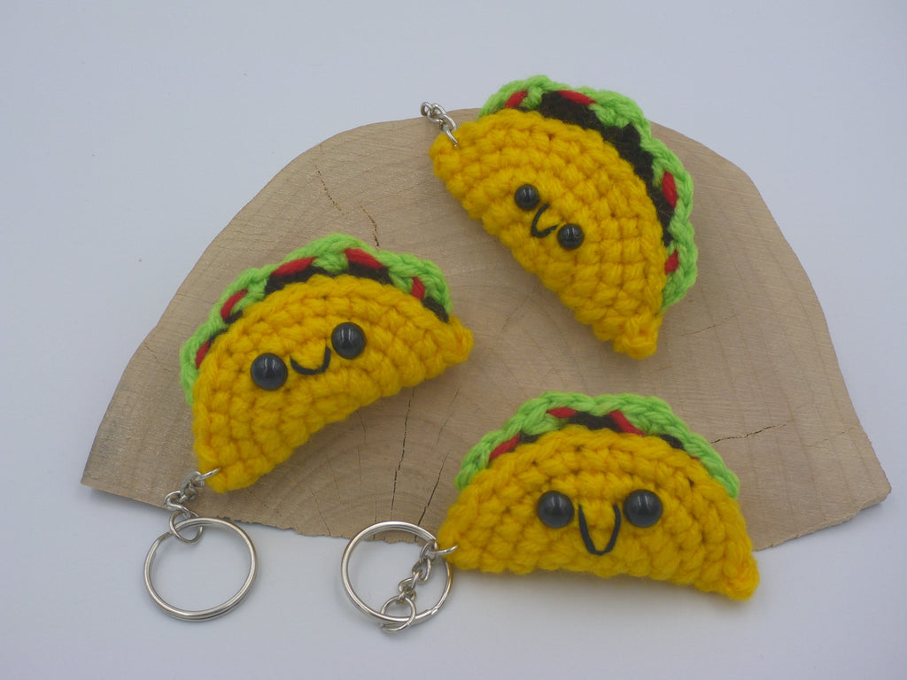 Taco measures approx. 2.5 inches wide by 1.5 inches tall and is made from acrylic yarn and stuffed with polyfil.